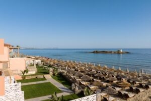 Pláž přímo u hotelu je písečná s pozvolným vstupem do moře. Lehátka a slunečníky jsou k zapůjčení zdarma, avšak za výměnu plážových osušek je účtován poplatek 2 EUR.