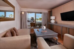 Ubytování je nabízeno v prostorných dvoulůžkových pokojích s možností přistýlky, vybavených klimatizací, telefonem, televizí, minibarem a balkonem nebo terasou. Hotel nabízí ubytování pouze osobám starším 17 let. Stravování je zajištěno formou polopenze s bohatým bufetovým podáváním snídaní a večeří. Večerní oblečení s dlouhými kalhotami je vyžadováno při večeři.