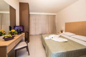 Pláž Kolymbia, jedna z nejkrásnějších písčito-oblázkových pláží, se nachází 600 metrů od hotelu a je dostupná pěšky nebo kyvadlovou dopravou, která jezdí několikrát denně. Na pláži si hosté mohou pronajmout lehátka a slunečníky, a vyzkoušet různé vodní sporty.