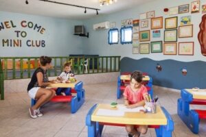 Ubytování zahrnuje 249 standardních pokojů, 12 Junior apartmánů Sea Breeze, 34 rezidenčních rodinných apartmánů a 2 apartmány Executive, vše s vlastní koupelnou, klimatizací, TV, minibarem a balkónem nebo terasou. All-inclusive stravování nabízí bufetové snídaně, obědy a večeře, a hosté mohou využít různá sportovní a relaxační zařízení.
