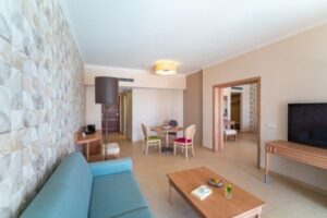 Ubytování zahrnuje prostorné dvoulůžkové pokoje s vlastním sociálním zařízením, včetně jacuzzi, vysoušeče vlasů, a WC. Pokoje jsou vybaveny telefonem, satelitním televizorem, miniledničkou, trezorem, individuální klimatizací a balkonem nebo terasou. Za příplatek jsou k dispozici pokoje s výhledem na moře, junior suity s výhledem na moře, suity s výhledem na moře, a junior suity s výhledem na moře a klimatizovaným privátním bazénem.